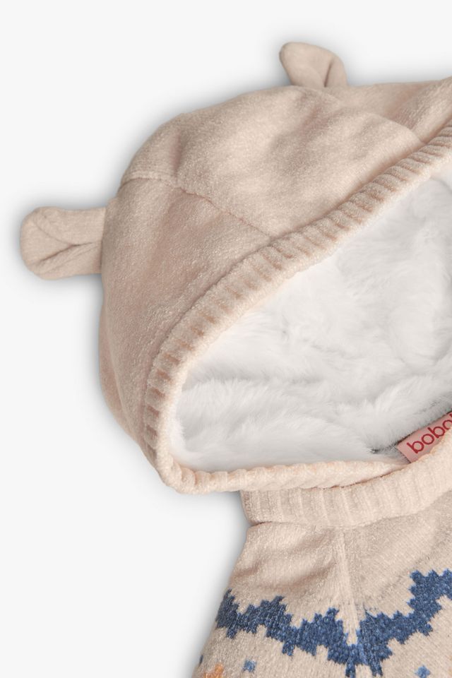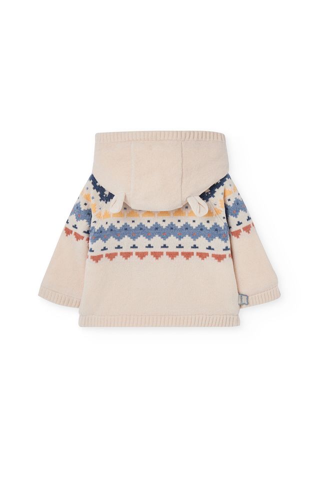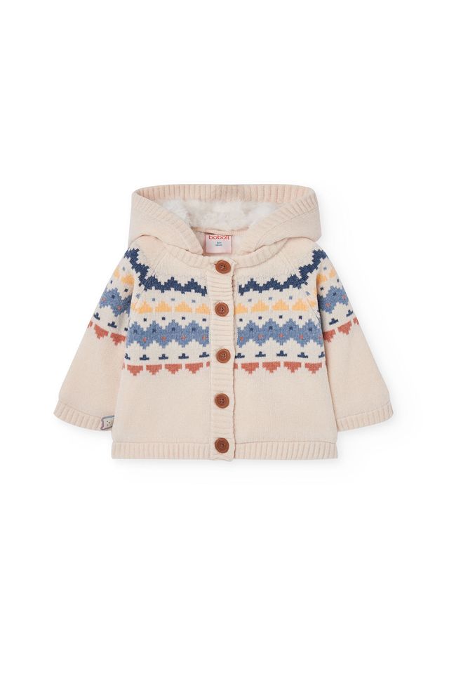 Cream knitted cardigan for baby, ideal for keeping your little one warm during the colder seasons, combining style and warmth with its classic design. Made from soft materials and suitably designed for the baby’s sensitive skin, this garment is perfect for daily wear during autumn and winter. It features a practical button closure for easy adjustment over everyday clothing or on special occasions. This versatile cardigan pairs harmoniously with trousers, leggings, or dresses, adding a cosy touch to your baby’s outfit.