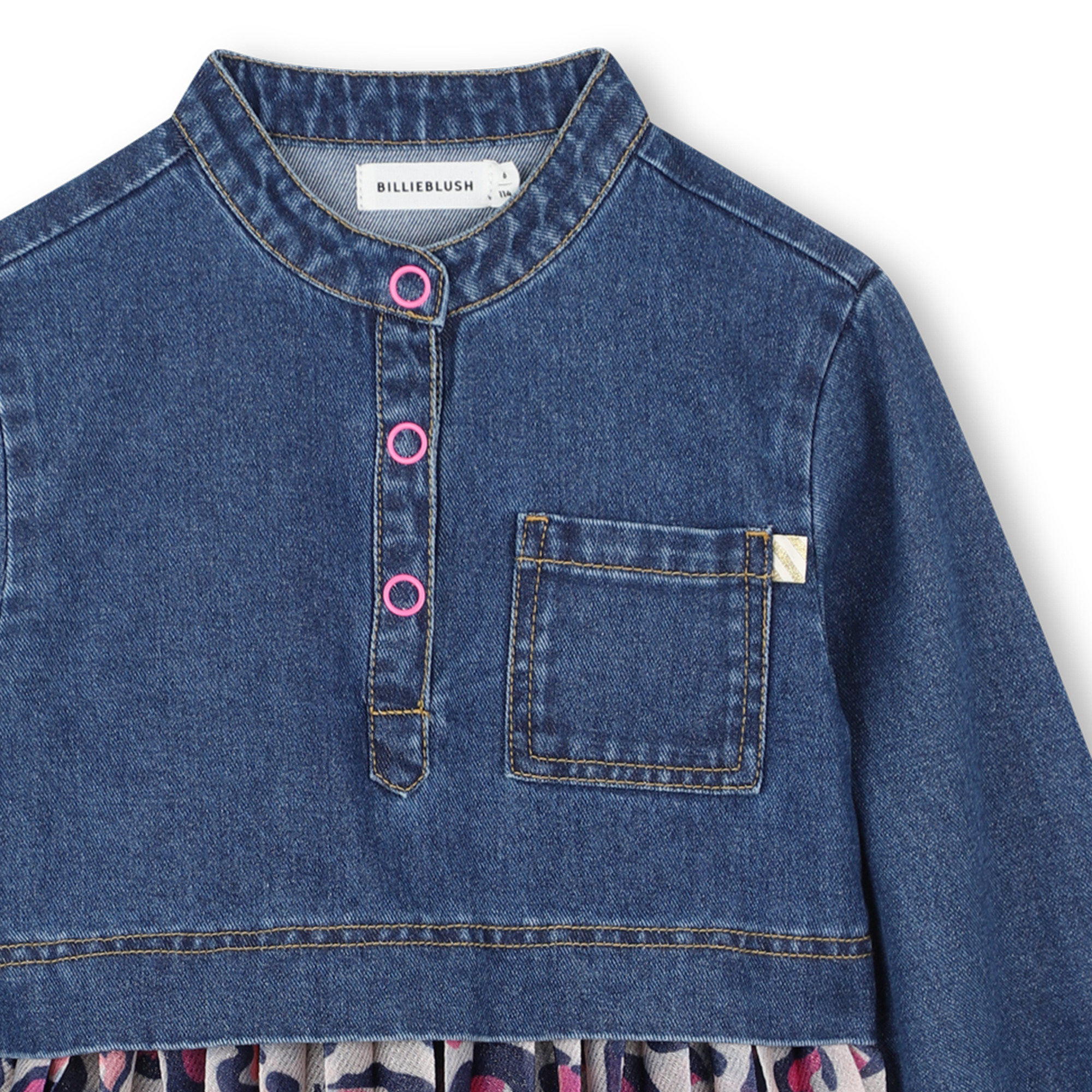 Playful, stylish, and comfortable, this blue and pink dress for girls by Billieblush is perfect for adding colour to her wardrobe. The long-sleeved bodice is crafted from mid-wash blue denim with a popper-fastening placket and a practical chest pocket, blending casual charm with practicality. The dress flows into a semi-sheer pleated skirt, lined in lightweight viscose for comfort, and decorated with a bold leopard hearts print in vibrant pink tones. A fun yet versatile piece, it’s ideal for everyday wear or special outings.