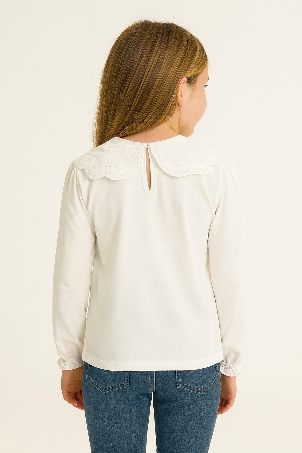 This elegant white twill blouse is made from 100% cotton for a soft, breathable feel. It features a delicate ruffled collar, wavy elastic cuffs, and an A-line cut for a comfortable, stylish fit. A button at the back makes dressing easy, creating a timeless and refined look perfect for any occasion.