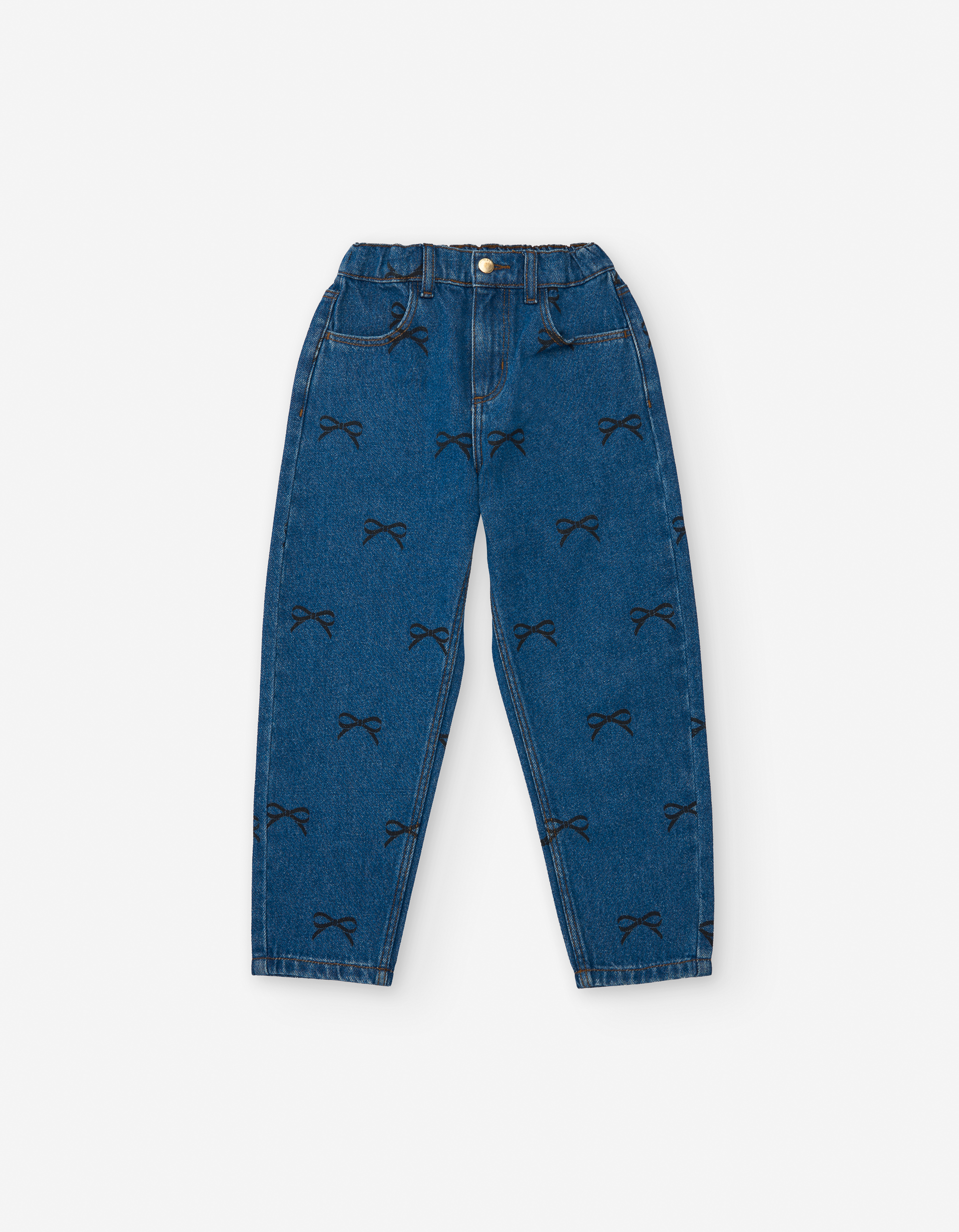 These classic blue jeans for girls are made from 100% cotton, featuring a dark blue bow motif for a subtle, playful touch. Designed with a straight fit, an elastic waistband adjustable with inner elastics and buttons, and four functional pockets, they combine comfort and practicality. Up to size 8/9, the jeans feature a snap button under a decorative button to make dressing easier and encourage your child’s independence.
