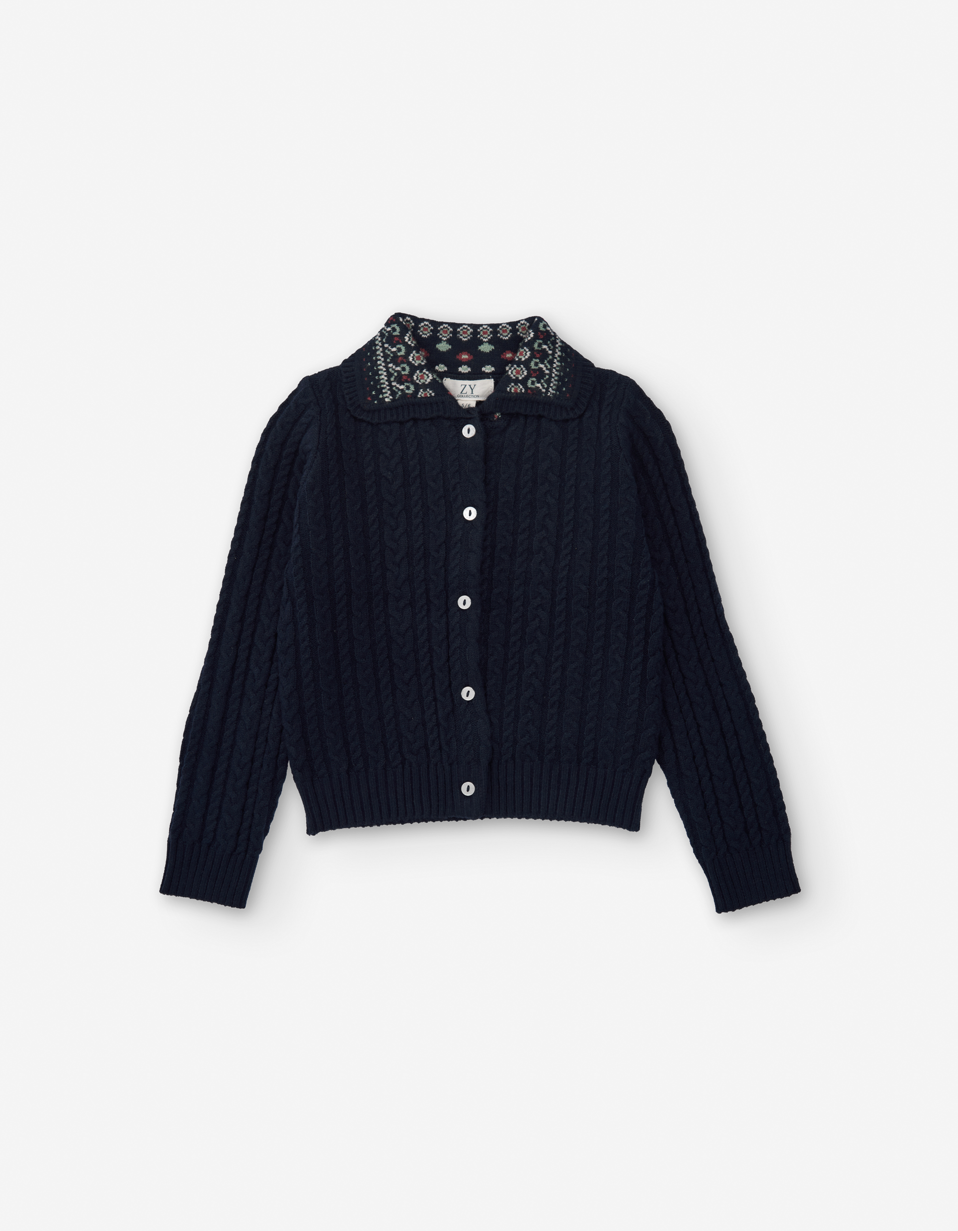 Dark blue knitted cardigan for girls. Peter Pan collar with floral jacquard in shades of pink, white and green. Imitation mother-of-pearl buttons. Ribbed edges for a perfect fit. A soft and comfortable option with a traditional touch.