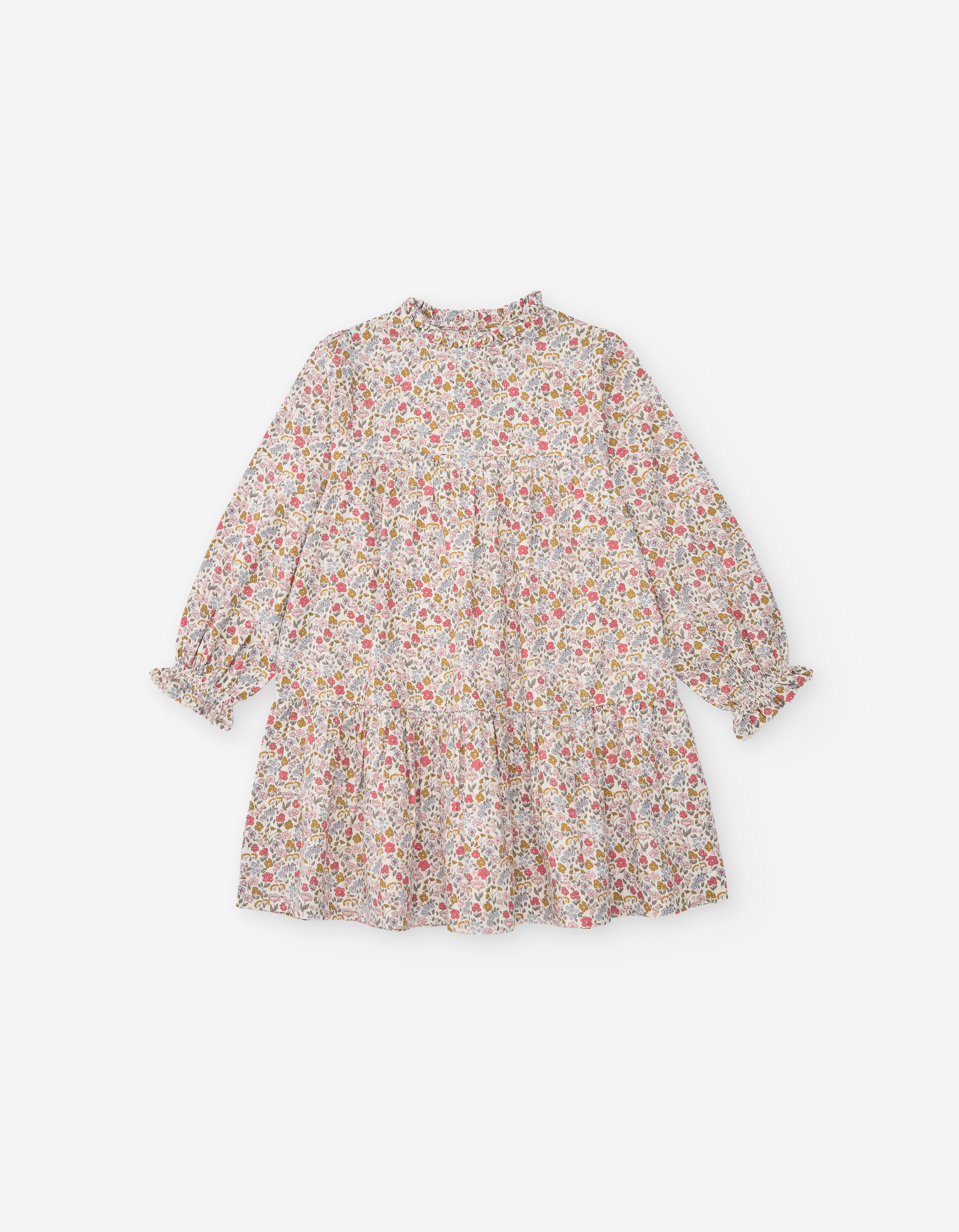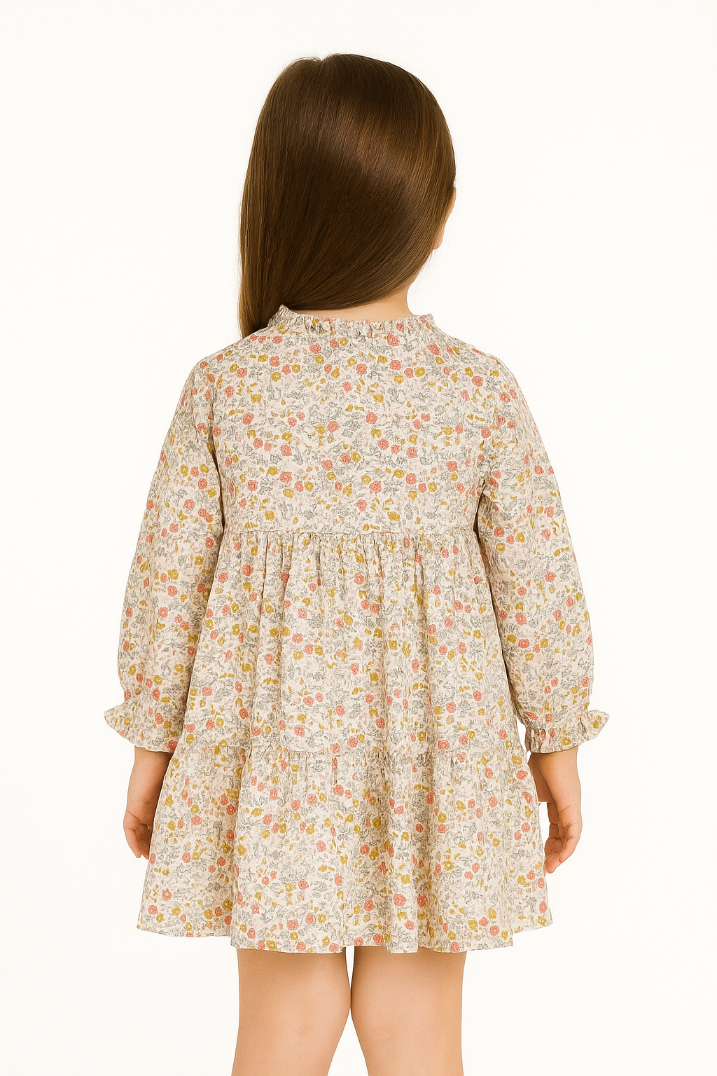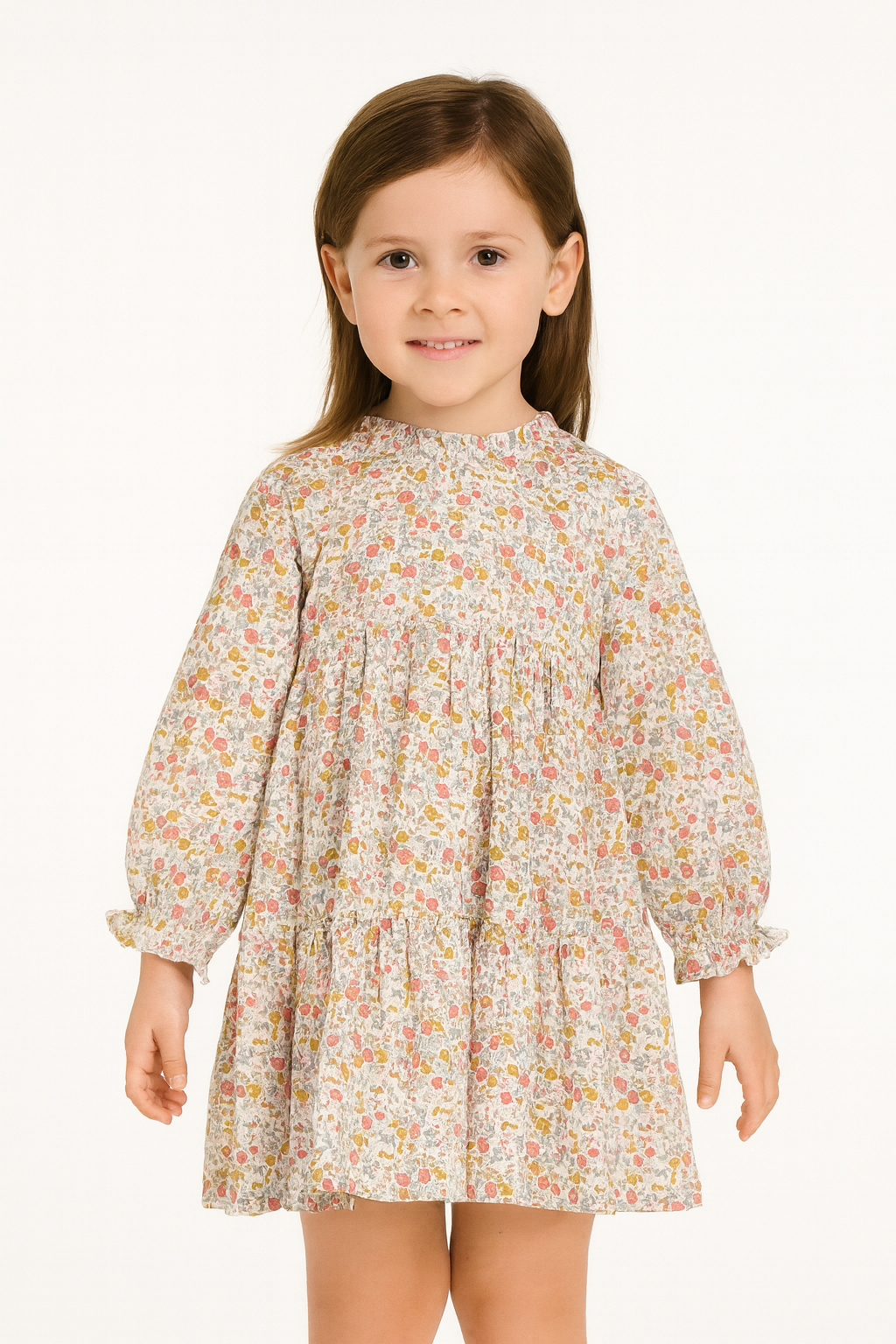 This charming Zippy floral dress is perfect for everyday wear or special occasions. Made from soft, breathable cotton, it features a delicate all-over floral print in warm pastel tones. The design includes long sleeves with gentle elastic cuffs, a frilled neckline, and a tiered skirt for a lovely, flowy shape. Comfortable and easy to wear, it’s a beautiful blend of style and practicality — ideal for any little girl’s wardrobe.