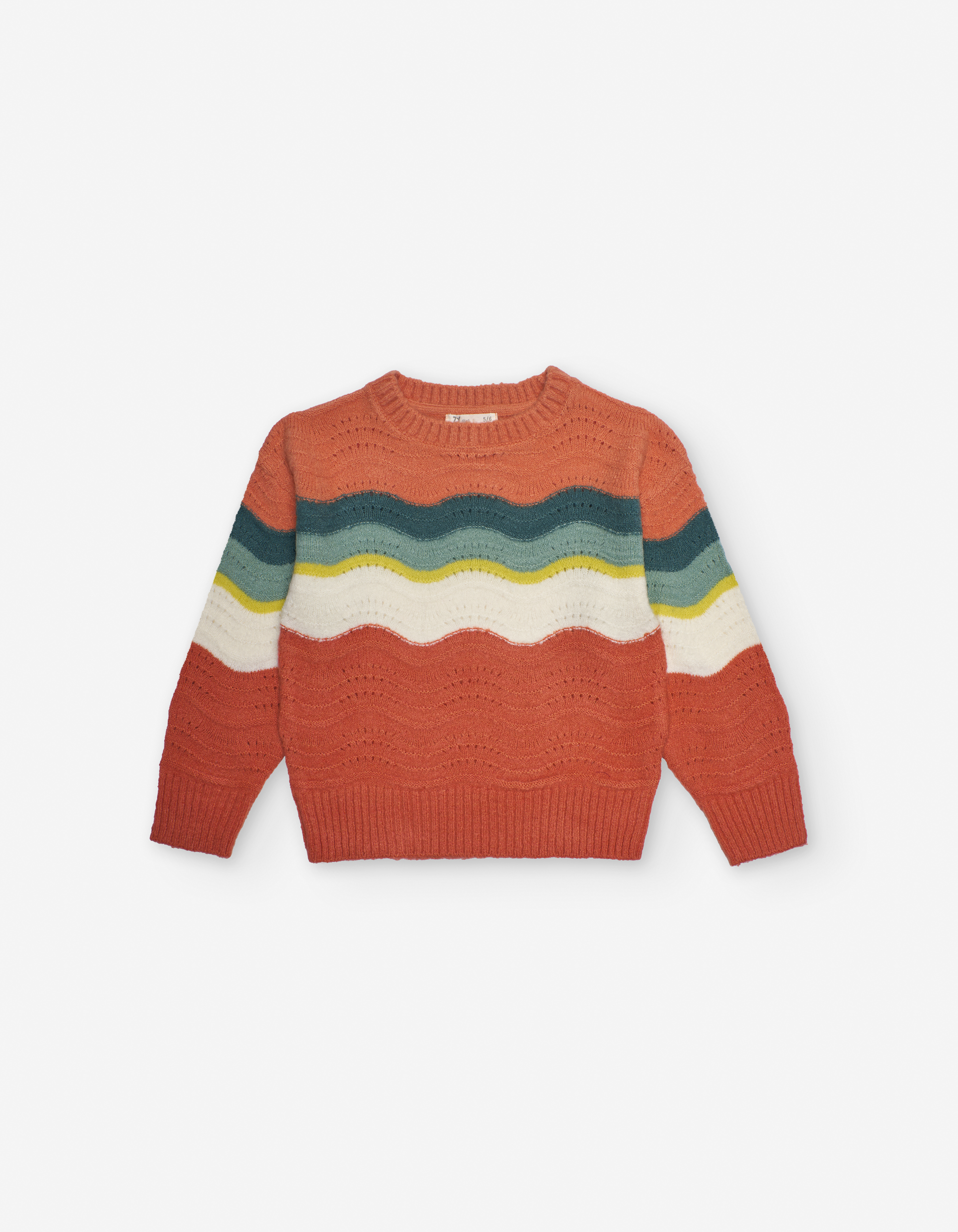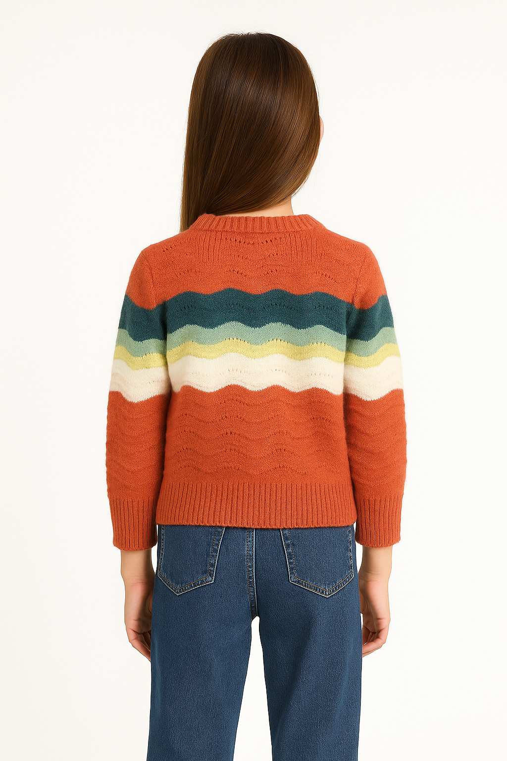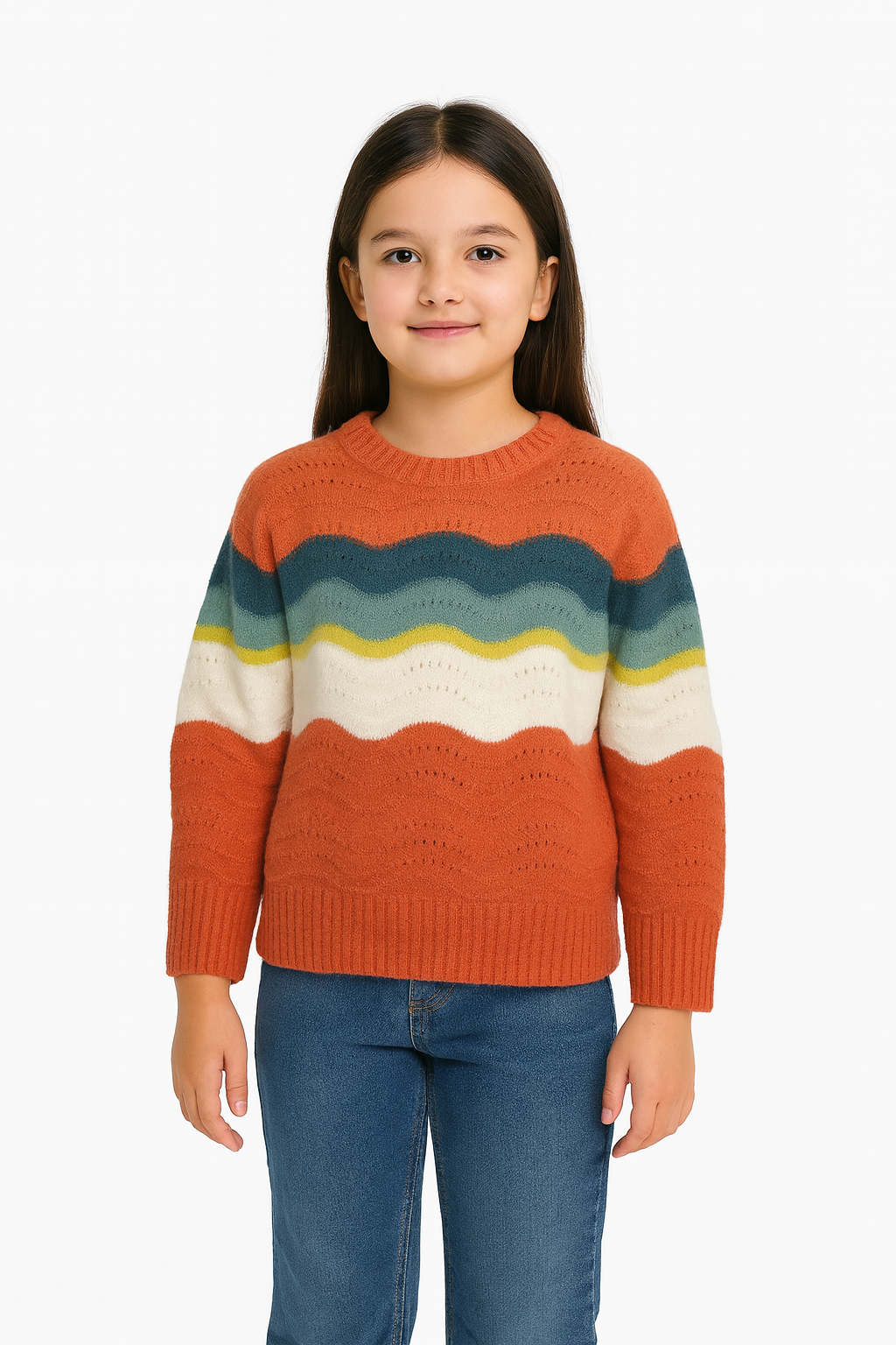 Bright and cheerful, this orange jumper features wavy stripes in green, white, and yellow, creating a fun and eye-catching look. Crafted from a soft and cosy fabric, it offers all-day comfort, while the ribbed cuffs ensure a perfect fit. A stylish piece with an original pattern, ideal for adding a pop of colour to any outfit.