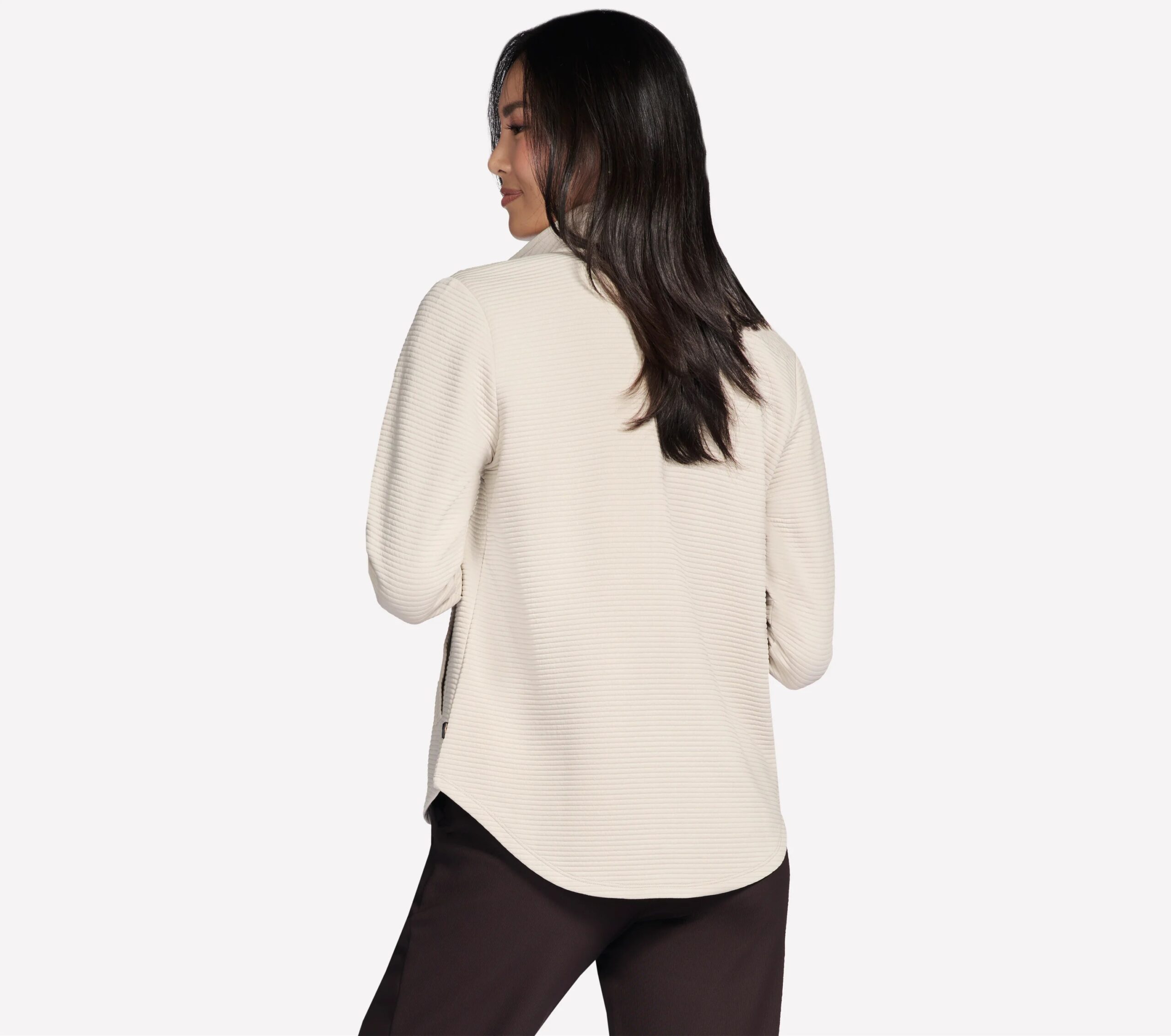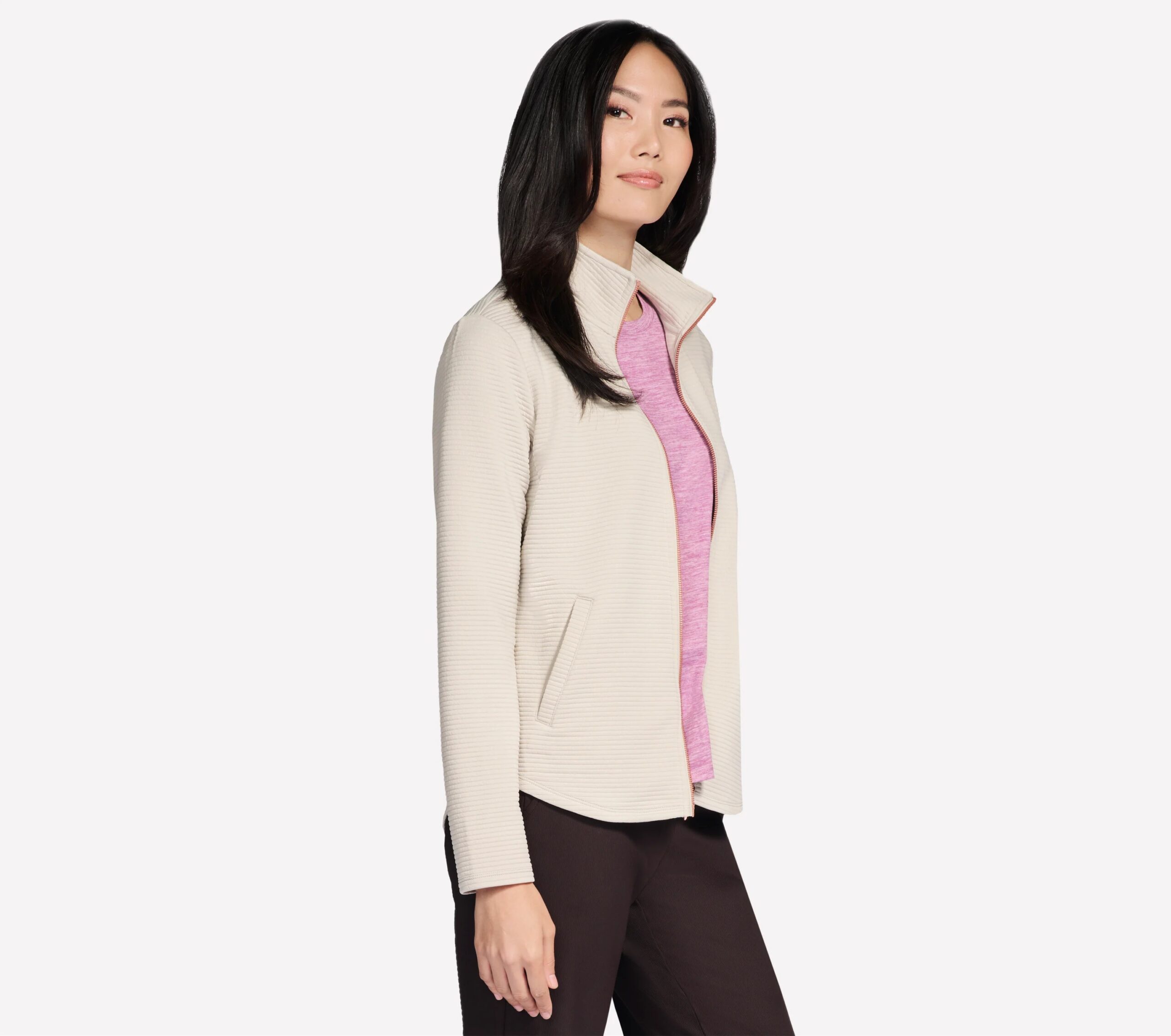 Stay active in stylish comfort with the Skechers GO WALK Shine Jacket. Designed for movement and ease, this sporty mock-neck layer is crafted from breathable Soft Knit Ottoman™ rib fabric, offering a smooth, flexible fit that feels great all day long. The zip-up front with a branded pull, scooped hem, and two welt hand pockets combine function and flattering style, making it perfect for workouts, walks, or casual outings